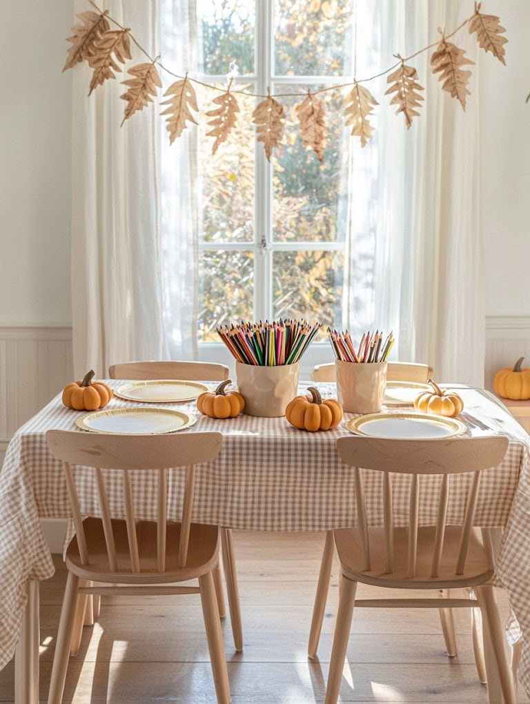 - Festive but Simple Decor – Mini pumpkins, leaf garlands, or paper turkeys add charm without being too fragile or fussy.